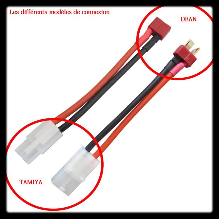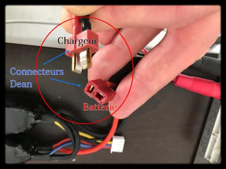 Dans le cas, ci-dessus, la batterie est en 11v et possède donc une broche adaptée pour 3 cells. Il vous suffit de brancher la broche de votre batterie sur le chargeur ainsi que le connecteur (ici connceteur DEAN) qui est aussi polarisé afin d'éviter de se tromper de sens entre le + et le -.