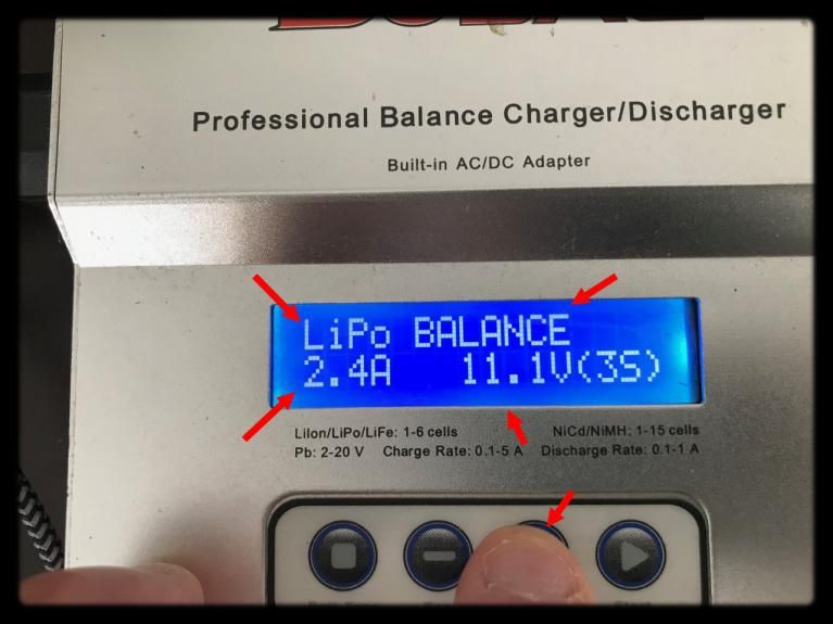 Vous devrer paramétrer votre chargeur en mode > LIPO + "BALANCE" + indiquer > 2.4A (pour 2400mA délivrabe) + indiquer > 11.1V (pour 3S = 3 cells) pour la tension. N'oubliez pas de choisir "BALANCE" et non "CHARGE" si vous avez une batterie qui dépasse les 3v et qui possède plusieurs cells !