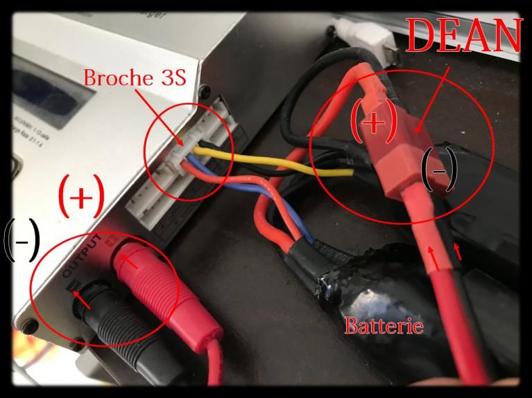 Le chargeur dispose d'une sortie OUTPUT (+ et -) pour aller se brancher vers le connecteur de votre batterie LIPO. Ici ce connecteur est de type DEAN mais pourrait être différent selon le modèle de batterie que vous avez (parfois TAMYA).