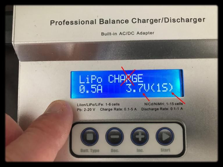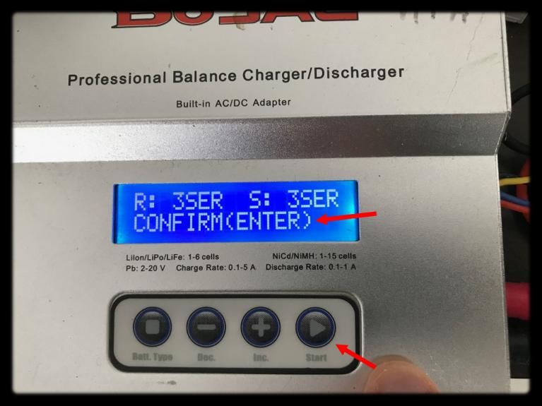 Vous devrer paramétrer votre chargeur en mode > LIPO + "BALANCE" + indiquer > 2.4A (pour 2400mA délivrabe) + indiquer > 11.1V (pour 3S = 3 cells) pour la tension. N'oubliez pas de choisir "BALANCE" et non "CHARGE" si vous avez une batterie qui dépasse les 3v et qui possède plusieurs cells !